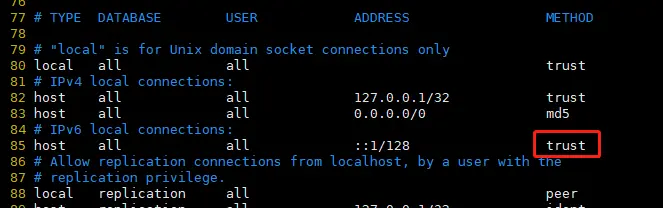 2020-03-13 00:25:00.002 CST [13650] DETAIL: Connection matched pg_hba.conf line 85: "host all all ::1/128 ident"