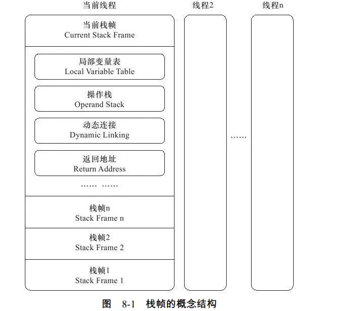 一个线程中的方法调用链可能会很长,很多方法都同时处于执行状态。 对于执行引擎来说,在活动线程中,只有位于栈顶的栈帧才是有效的,称为当前栈帧(Current StackFrame),与这个栈帧相关联的方法称为当前方法(Current Method)。 执行引擎运行的所有字节码指令都只针对当前栈帧进行操作,在概念模型上,典型的栈帧结构如图8-1所示。