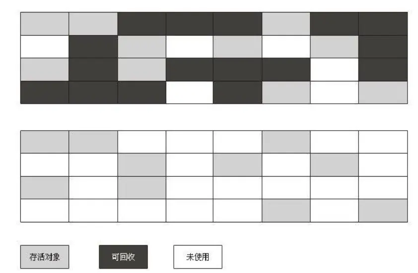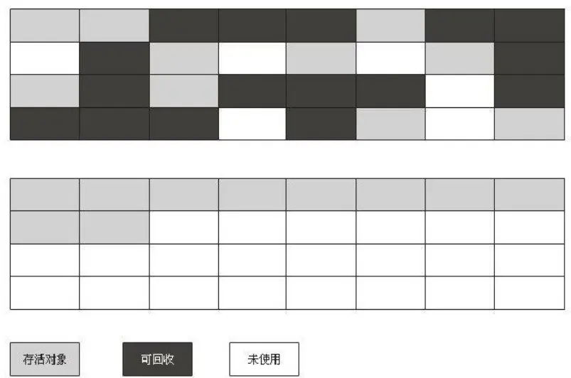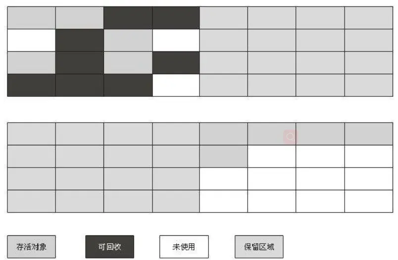一个是效率问题,标记和清除两个过程的效率都不高;另一个是空间问题,标记清除之后会产生大量不连续的内存碎片,空间碎片太多可能会导致以后在程序运行过程中需要分配较大对象时,无法找到足够的连续内存而不得不提前触发另一次垃圾收集动作。 标记—清除算法的执行过程如下图所示。