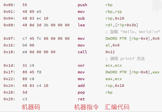 解释器会将字节码转换成汇编指令,然后在转换成CPU可以识别的机器指令(下图是汇编指令转成机器码的案例)。解释器是软件实现的,他将字节码转换成汇编指令,可以实现同一份Java字节码在不同的硬件上运行,而将汇编指令转换成机器指令由硬件直接实现,所以他的速度会更快。JVM为了提升运行效率,会将某些热点代码,一次全部编译成机器指令再执行。也就是和解释执行对应的即时编译,即时编译的机器码存放在一个叫codecache的缓存的地方,这块内存属于堆外内存,如果这块内存不够了,那么即时编译器将不会再进行编译,可能造成程序运行变慢,这也是排查性能问题变慢的一个点。