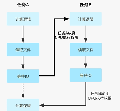 CPU一通上电就会不停的读取指令、运算,周而复始。CPU会给系统运行中的每一个进程都分配一个时间片,在这个时间片内执行对应的进程的指令,过了这个时间片就执行其他的进程,一个进程内的指令执行的顺序,靠每个指令执行完,再去指向下一个指令的位置。当然一个进程内的某些操作,也会主动放弃CPU的执行权限,比如等待IO的操作(如下图),所以为了让一个进程内的指令可以更高效的执行,我们可以让某个线程在等待IO的时候,其他线程能够获取到CPU的执行权限,并继续执行,如果你的任务都是计算型的任务,基本不会有主动释放CPU的情况,那么在单核机器上就没必要开多线程,如果有大量的IO操作那么多线程的效果就会比较好。