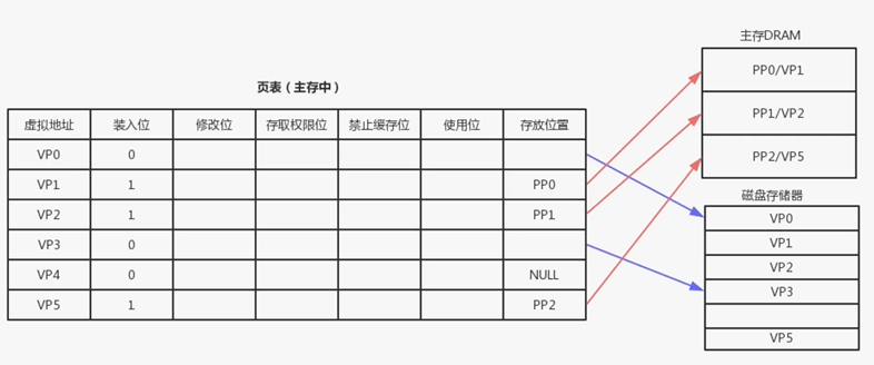 而这个虚拟内存空间可能会超过物理内存,当超过物理内存的时候,可能会发生数据溢出,从而存储到磁盘上。页表保存了虚拟地址和物理地址的映射(如下图),页表是一个数组,每一个元素为一个页的映射关系,这个映射关系可能是和主存的,也可能是和磁盘的,页表存储在主存中,也可能存储在缓冲区,我们将存储在高速缓冲区中的页称为TLAB。