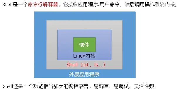 shell的中文意思就是贝壳,其实比较类似于我们内核的壳。简而言之就是只要能够操作应用程序的接口都能够称为SHELL。狭义的shell指的是命令行方面的软件,广义的SHELL则包括图形界面。
