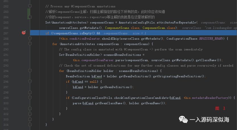 感觉过了一个世纪,才走到重点方法。我们看到,这里就是处理 ComponentScans 注解的地方,为什么是 Set 我就不用说了吧,因为里面放的是数组。 可以看到这里还有一个 shouldSkip 的判断,当然肯定是 false,和上面那个一样,Configuration 配置类,没有添加 Condition 注解。