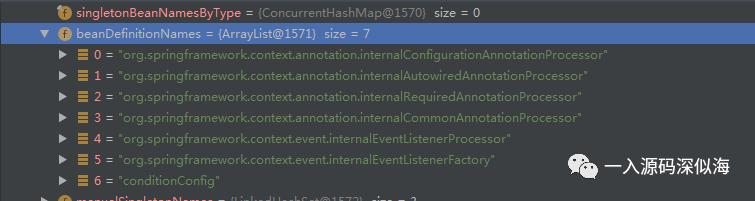 此时 Spring 容器中的 beanDefinitionNames 还是 7 个,我们来看一下。