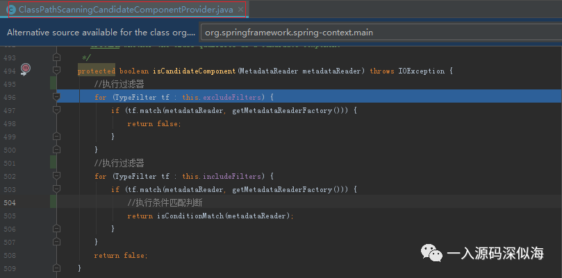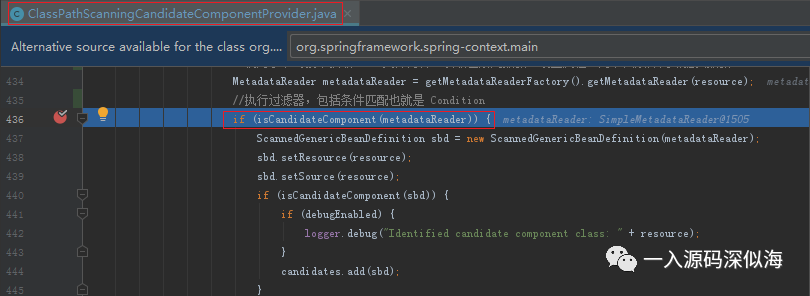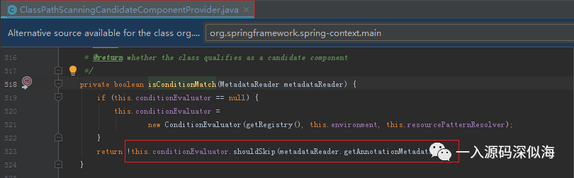 isCandidateComponent 方法就是执行 Condition 判断的方法。 获取到的 MetadataReader 对象会在初始化的时候,调用字节码技术来读取 Class 文件,获取 UserService 上面标注的注解元数据。为下面条件匹配时,判断注解是否被包含。