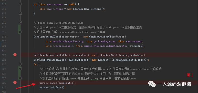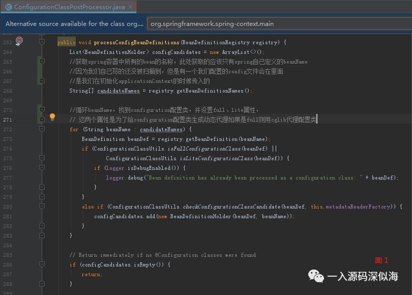 此方法主要用来解析标注了 Configuration 注解的类。从方法名就可以看出来。 首先获取了 Spring 容器中所有的 beanName 集合,主要是 Spring 内部的一些后置处理器,还有我们在程序刚开始的时候提供的配置类。