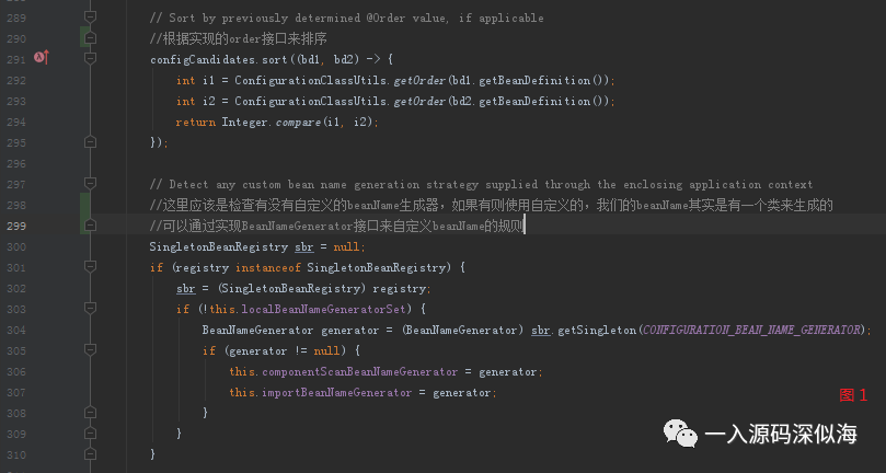 接下来创建 BeanDefinitionHolder 集合,只是对 BeanDefinition 包装了一下,然后进行排序,如果实现了 Order 接口,会返回一个排序的数字,根据数字进行排序。 然后检测是否有自定义的 BeanNameGenerator。