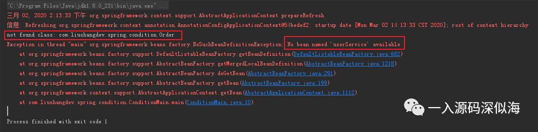 白色部分日志,是我在捕捉到加载不到类报异常时,打印的日志,你还可以看到最熟悉的 Spring 报的错,找不到 Bean 定义。说明我们的注解已经生效了。 如果我把注解里面的值改成 User,那就可以了。
