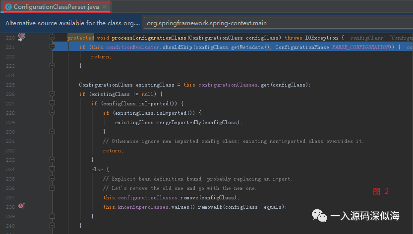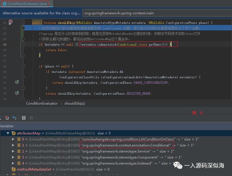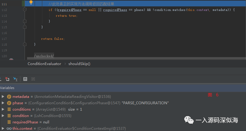 请看第一个判断 shouldSkip,其实这里就是调用我们 matches 方法的代码,只是我们的配置类没有添加 Conditional 注解,所以肯定为 false。