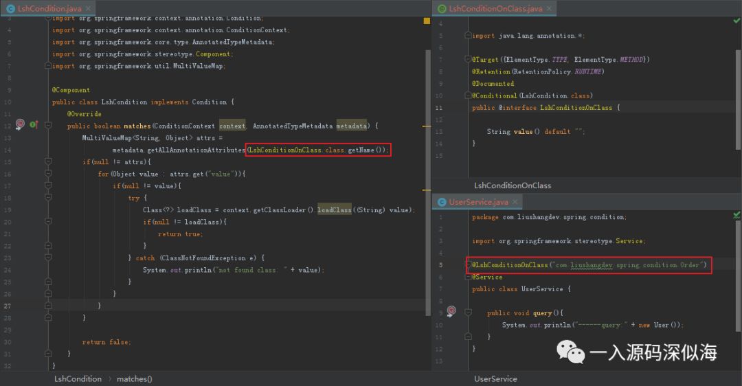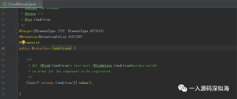 注解接受一个 Class 数组类型的值,但是Class 必须是上面 Condition 接口的子类,也就是说,该注解的值必须实现 Condition 接口,从这个地方我们可以分析得出,其实 Spring 在判断过程中,就是调用了 matches 方法,根据返回值,来确定最终的结果。看到这里我们应该大致明白是怎么回事了。