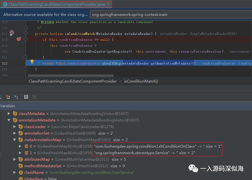 是不是有点激动,终于看到了这行代码。 后面还有很多,哈哈。此处的 metadataReader.getAnnotationMetadata() 方法是获取 UserService 类上的注解,是不是就是我们在 UserService 类中声明的两个注解。