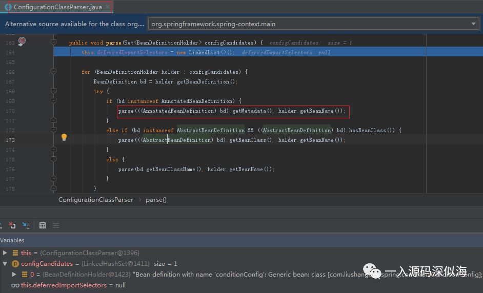 由于程序中只提供了一个 Configuration 配置类,所以集合中只有一个元素,就是我们的配置类,然后判断 BeanDefinition 的类型,我们这里是注解类型的。