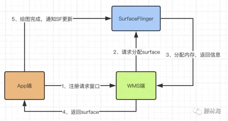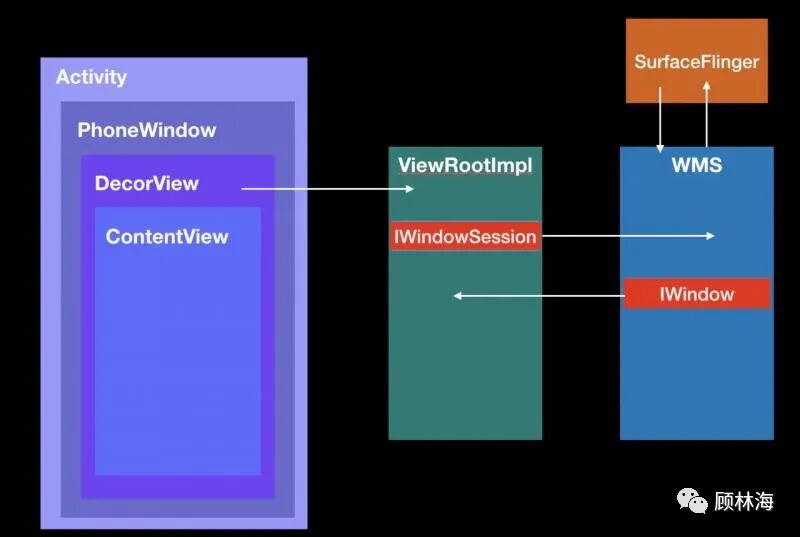 1、创建PhoneWindow对象,往PhoneWindow对象里面添加了一个DecorView2、为DecorView绑定一个ViewRootImpl,由这个ViewRootImpl负责View的绘制和刷新3、ViewRootImpl通过IWindowSession向WMS发起Binder调用,而WMS也会通过IWindow向应用端发起调用 4、ViewRootImpl会在WMS里面注册一个窗口,然后由WMS统一的管理所有窗口的大小,位置和层级5、在第一次绘制时,ViewRootImpl还会向WMS申请一块Surface(WMS向Surface申请),有了Surface之后,应用端就可以进行绘制了6、应用端绘制完之后,SurfaceFlinger就会按照WMS里面提供的层级等信息进行合成,最终显示