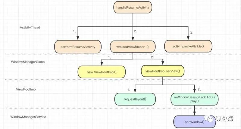 ---->类:ActivityThread.java@Override public void handleResumeActivity(IBinder token,..){ // TODO Push resumeArgs into the activity for consideration //1、 final ActivityClientRecord r = performResumeActivity(token, finalStateRequest, reason); final Activity a = r.activity; if (r.window == null && !a.mFinished && willBeVisible) { r.window = r.activity.getWindow(); View decor = r.window.getDecorView(); decor.setVisibility(View.INVISIBLE); ViewManager wm = a.getWindowManager(); WindowManager.LayoutParams l = r.window.getAttributes(); a.mDecor = decor; if (a.mVisibleFromClient) { if (!a.mWindowAdded) { a.mWindowAdded = true; //2、 wm.addView(decor, l); } else { ... } } if (!r.activity.mFinished && willBeVisible && r.activity.mDecor != null && !r.hideForNow) { ... if (r.activity.mVisibleFromClient) { //3、 r.activity.makeVisible(); } } }
