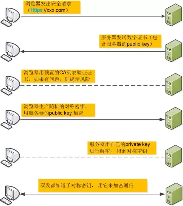 https是在tcp和http中间加了一层ssl/tsl的协议,使用非对称加密协议传输对称协议的秘钥,对称加密协议传输。 首先客户端向服务器发起安全请求,服务器返回自己的数字证书,客服端收到后用让ca验证数字证书的真实性,如果真的就获得了服务器的公钥,然后用服务器公钥加密此次对称协议加密的秘钥,服务器收到后用自己的秘钥解析获得 传输秘钥,开始传输。