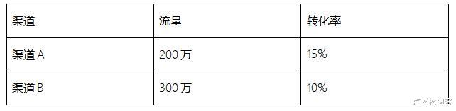 总的DAU = 渠道A流量*转化率+渠道B流量*转化率=200万*15%+300万*10%=60万。