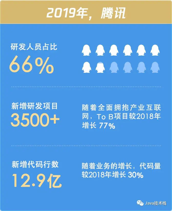 在代码数量上,2019 年腾讯新增代码行数 12.9 亿,相比 2018 年增长了 30%。