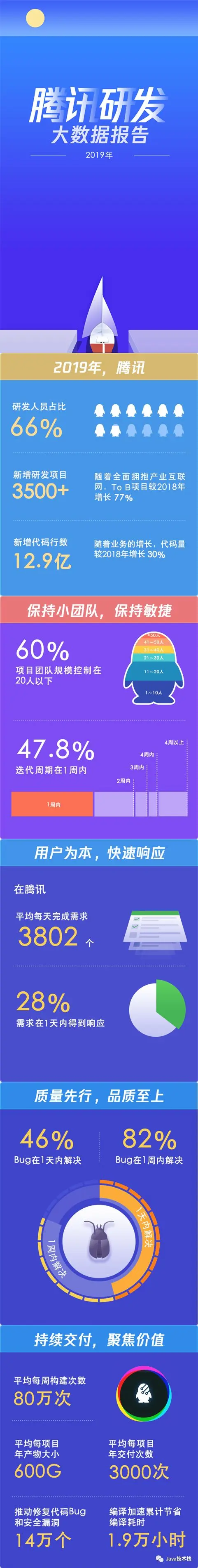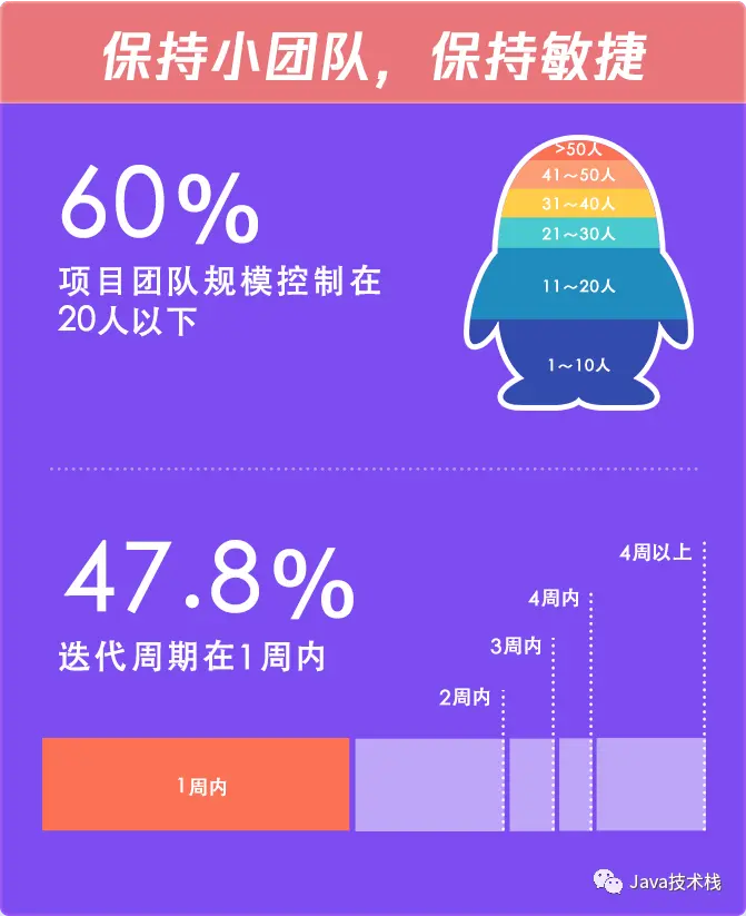 数据显示,腾讯 60% 的项目团队规模在 20 人以下,47.8% 的项目迭代周期在 1 周之内,平均每天完成用户需求 3802 个,而 28% 的需求可以在 1 天内得到响应。