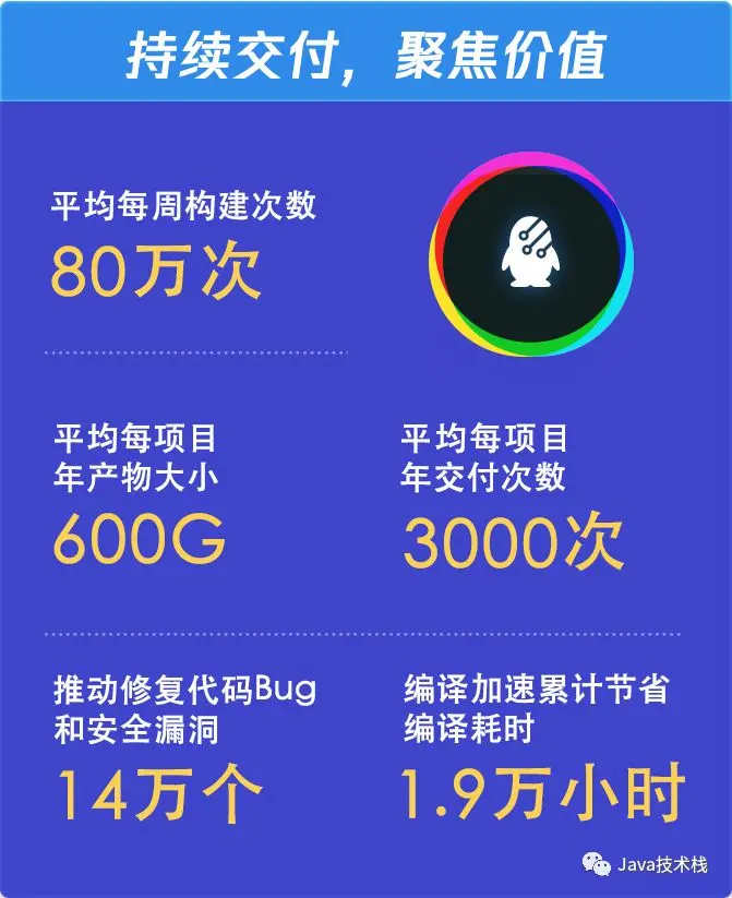 在研发的持续交付方面,腾讯平均每周构建次数达 80 万次,项目年均产物大小 600G,年均交付次数 3000 次,推动修复代码 Bug 和安全漏洞 14 万个,编译加速累计节省编译耗时 1.9 个万小时。
