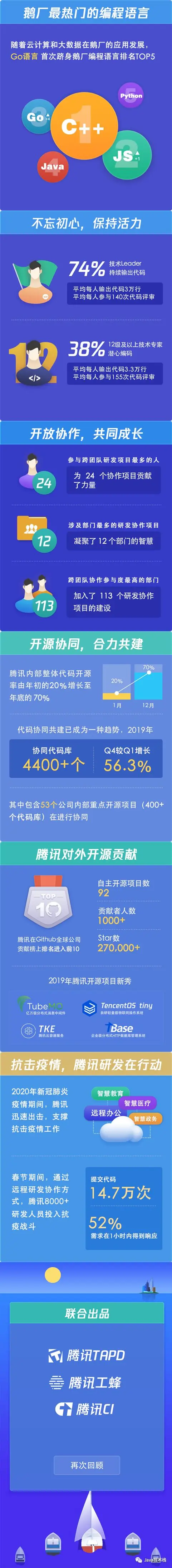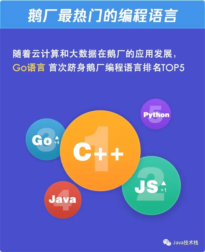 随着腾讯云计算和大数据相关业务的迅速发展,Go 语言首次跻身腾讯编程语言排名 TOP5;整个 2019 年,腾讯内部使用最多的五种编程语言分别是:C++、JavaScript、Go、Java 与 Python。
