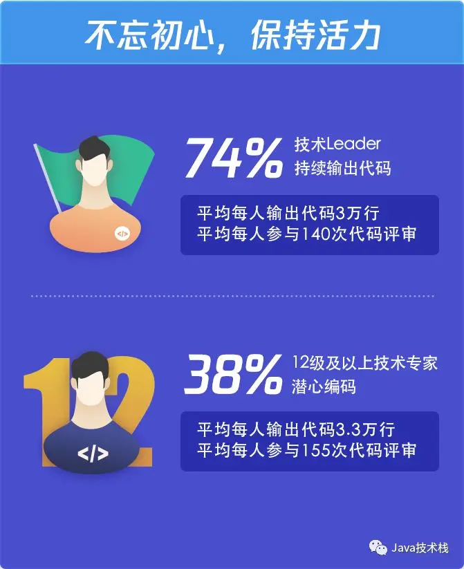 在技术管理人员的研发参与度上,腾讯 74% 的技术 Leader 仍在持续输出代码,2019 全年,平均每人输出代码 3 万行,参与 140 次代码评审;38% 的 12 级及以上技术专家潜心编码,平均每人输出代码 3.3 万行,参与 155 次代码评审。