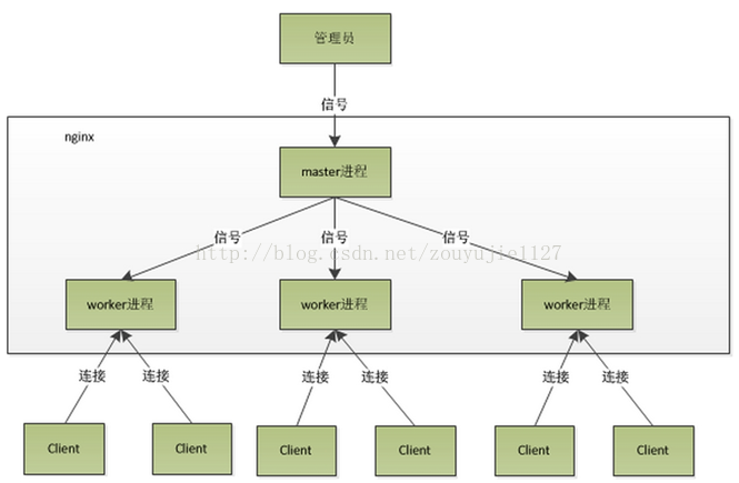 (1) nginx在启动后,会有一个master进程和多个worker进程。master进程主要用来管理worker进程,包含:接收来自外界的信号,向各worker进程发送信号,监控 worker进程的运行状态,当worker进程退出后(异常情况下),会自动重新启动新的worker进程。而基本的网络事件,则是放在worker进程中来处理了 。多个worker进程之间是对等的,他们同等竞争来自客户端的请求,各进程互相之间是独立的 。一个请求,只可能在一个worker进程中处理,一个worker进程,不可能处理其它进程的请求。 worker进程的个数是可以设置的,一般我们会设置与机器cpu核数一致,这里面的原因与nginx的进程模型以及事件处理模型是分不开的 。