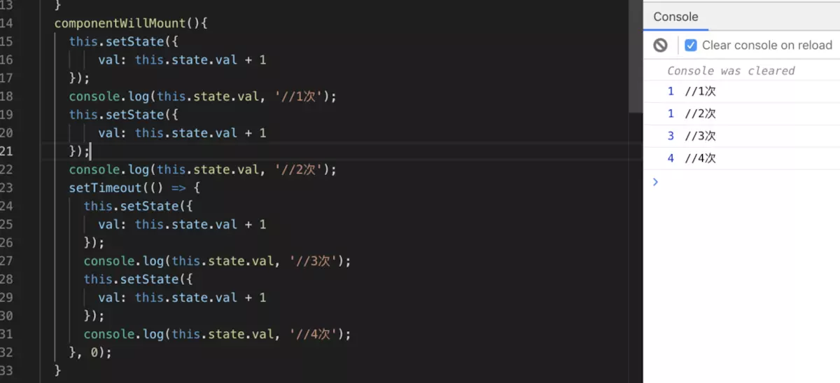 当执行到 setTimeout 的时候,把它丢到列队里,并没有去执行,而是先执行的 finally 主进程代码块,等 finally 执行完了, isBatchingUpdates 又变为了 false ,导致最后去执行队列里的 setState 时候, requestWork 走的是和原生事件一样的 expirationTime === Sync if分支,所以表现就会和原生事件一样,可以同步拿到最新的state的值。