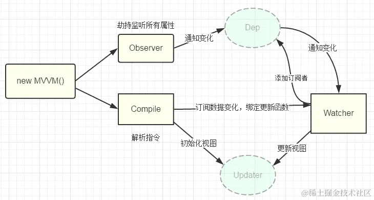循环 app,里面的子节点,如果是 输入框并且有 v-modle的话,就给输入框一个监听事件,获取值,并且往订阅池里面添加一个 watcher,后续用来更新输入框。 如果节点是有 v-bind 的话,也是往订阅池添加一个 watcher,但是这次是改成了innerHTML,后续用来改变文本