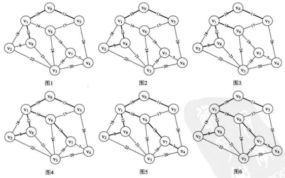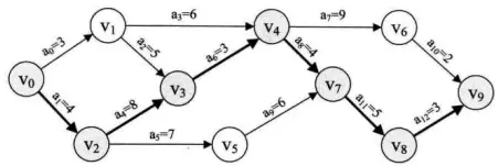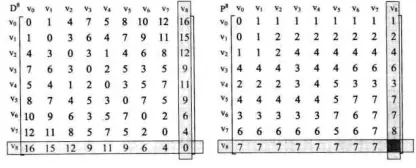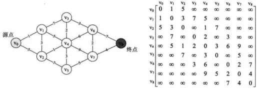 求v0到v8的最短路径:先求出v0到v1、v2的最短路径,再求出v0到v3、v4、v5的最短路径,然后求出v0到v6、v7的最短路径,最后求出v0到v8的最短路径