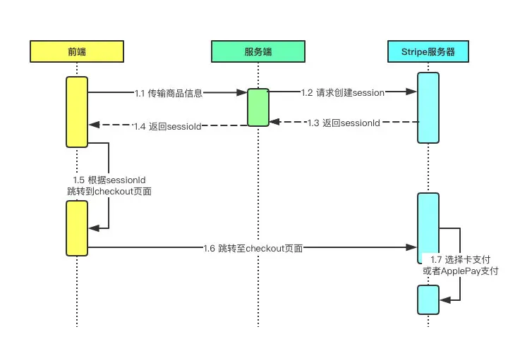我们选择一个最简单的集成方式,就是集成Stripe的Chekcout页面,只需要几行代码就能够集成Stripe的支付能力。大概的流程我用时序图表示,如下所示: