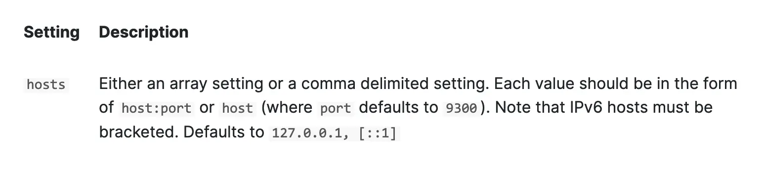 hosts多个之间用逗号隔开,每一项都是host:port,如果只有host,则默认端口号为9300。7.1版本的配置参数为:discovery.seed_hosts。