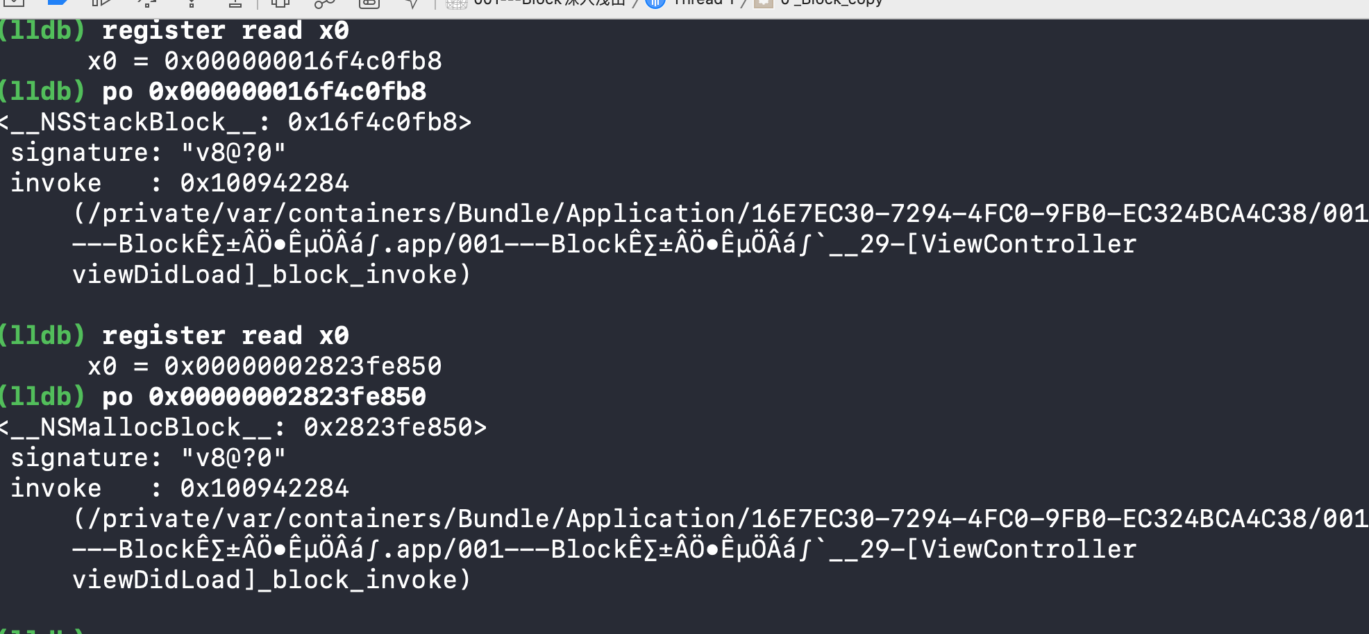 在block处设置一个断点,进入汇编,objc_retainBlock、我们在此时读一下寄存器,继续跳转会进入,_Block_copy,在_Block_copy的return处读一下寄存器。结果如下图所示:
