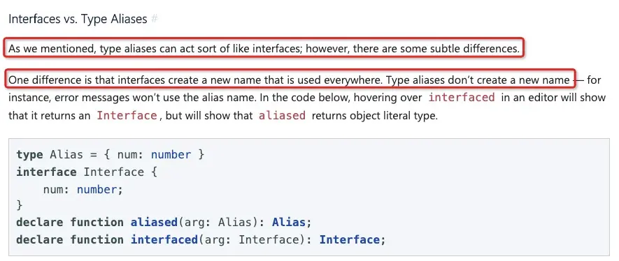 第二句红线指出: interfaces创造了一个新的名字,并被用在了任何地方。而type aliases不会创建新的名字