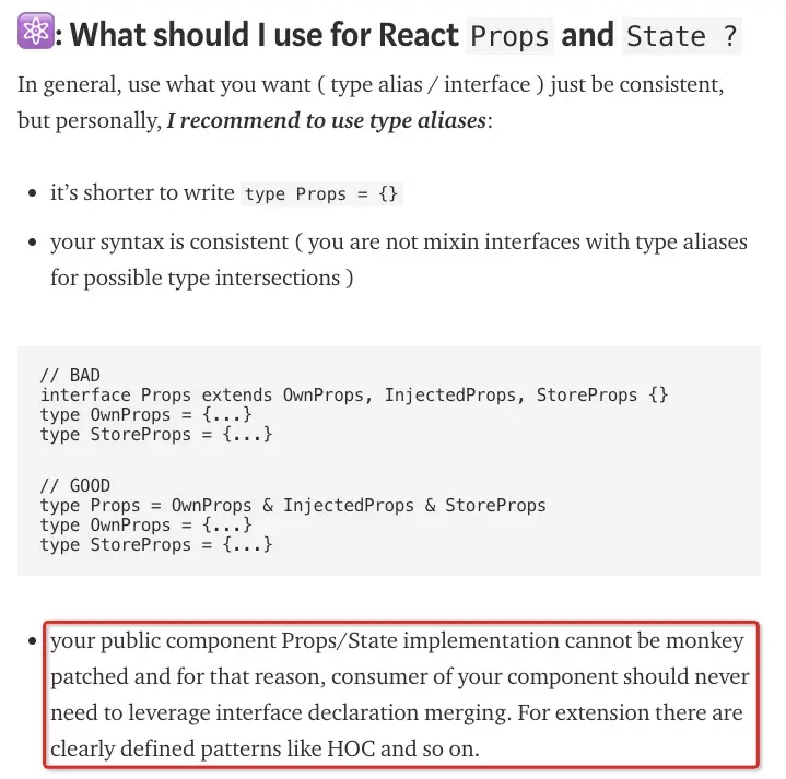 interface存在declaration merging而type alias做不到,react组件中的Props/state不能被monkey-patch(猴子补丁),所以推荐使用type alias来处理react组件中的Props/state