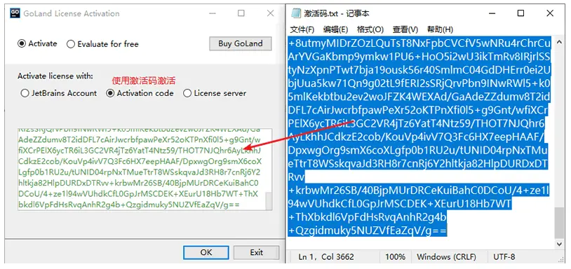 接着打开回到你的 Goland 启动界面,点击 Activation code,复制 激活码.txt 中的激活码,填入再点击 OK