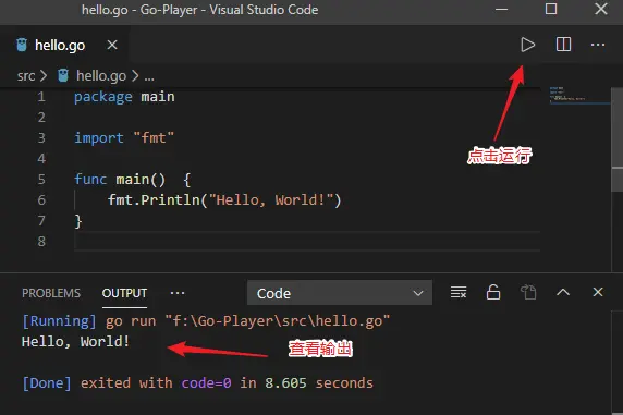 点击运行按钮,在控制台我们看到了熟悉的 Hello, World!