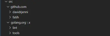 在项目根目录下,创建如下三个文件夹,并在 src 目录下创建一个hello.go 的文件。