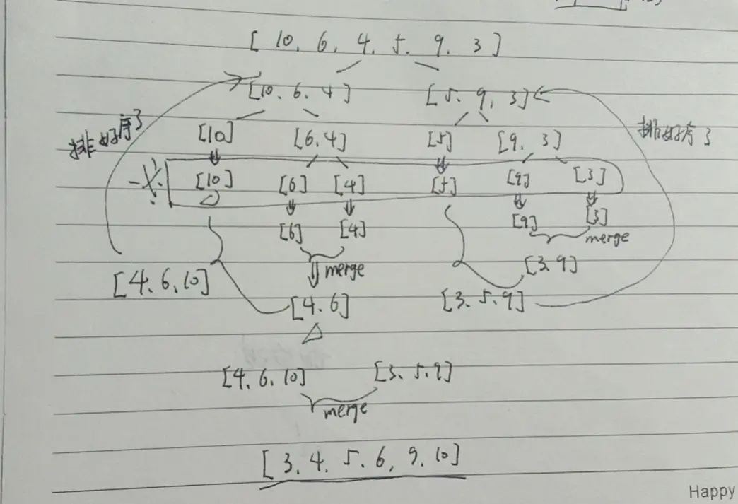 归并排序是不断拆分成两半,直到拆到就剩一个了,通过合并操作,合并成有序的数组。合并才是重点。