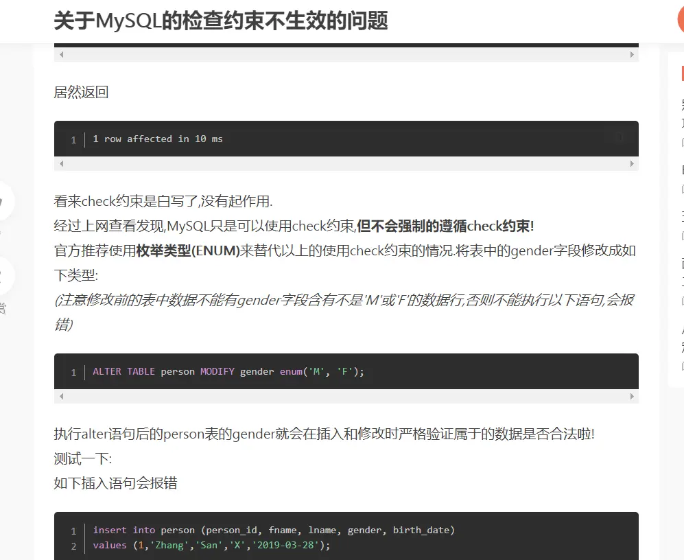 MYSQL对检查性约束check不起强制性作用,可以说没作用,但是MYSQL官方对CHECK改成了ENUM对列属性做了限制