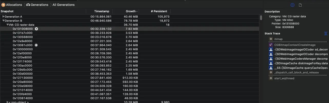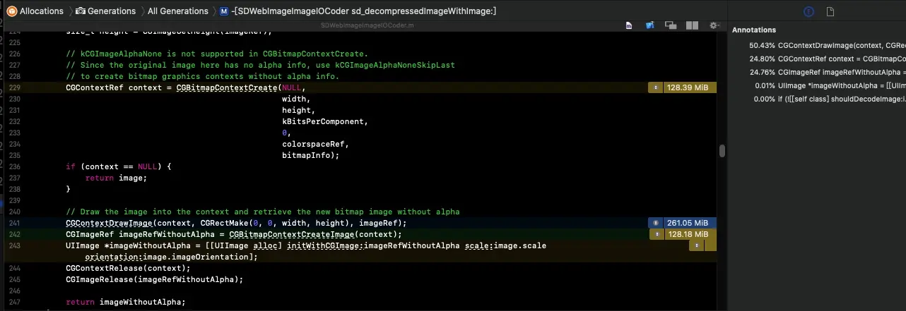 定位到SDWebImage在对图片进行解压缩的时候内存爆增,但是从代码中看Create和Realse配对使用,看起来也没什么问题,那就应该不是内存泄漏了,应该是这几行代码在执行过程中产生的内存消耗,但是为什么消耗这么大???