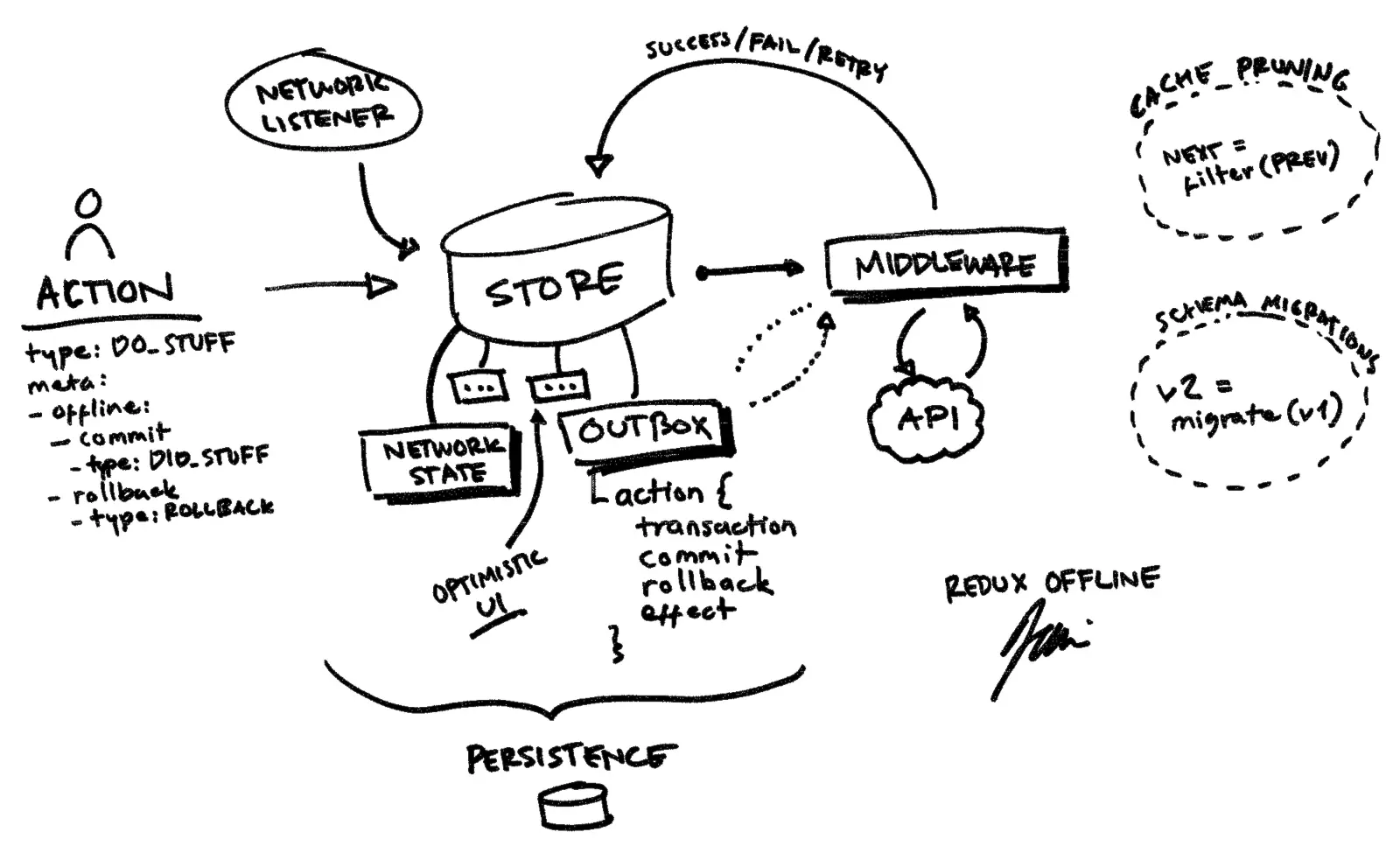 Redux 原本并不复杂,其基本理念可以概括为:通过 action 提交变更,经过 reducer 计算出新的 state。action 是一个约定含 type 字段的对象,reducer 是一个约定以 state 和 action 为参数、以新的 state 为返回值的纯函数。