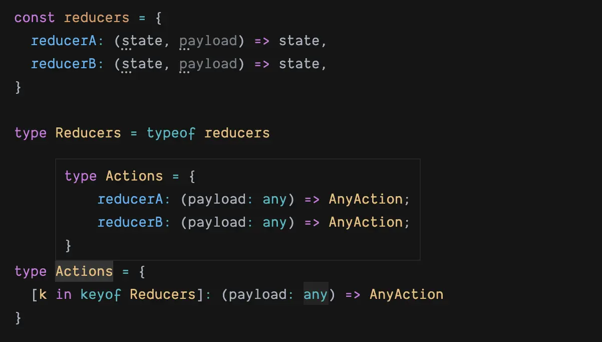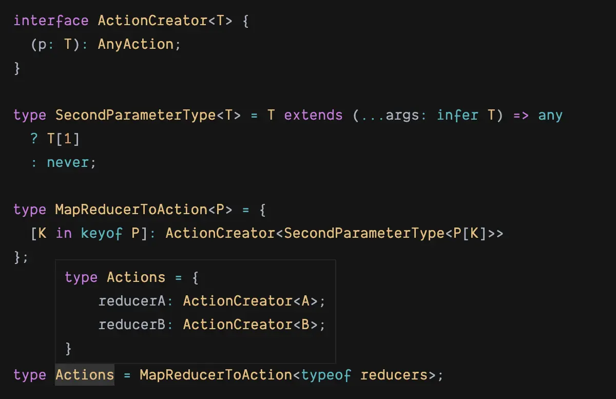 考虑到 action 函数的参数类型和对应 reducer 第二个参数的类型是一致的,那么能否既复用 reducer 的名称,又复用参数类型,在自动生成 actions 对象的同时,连类型也一起自动生成呢?