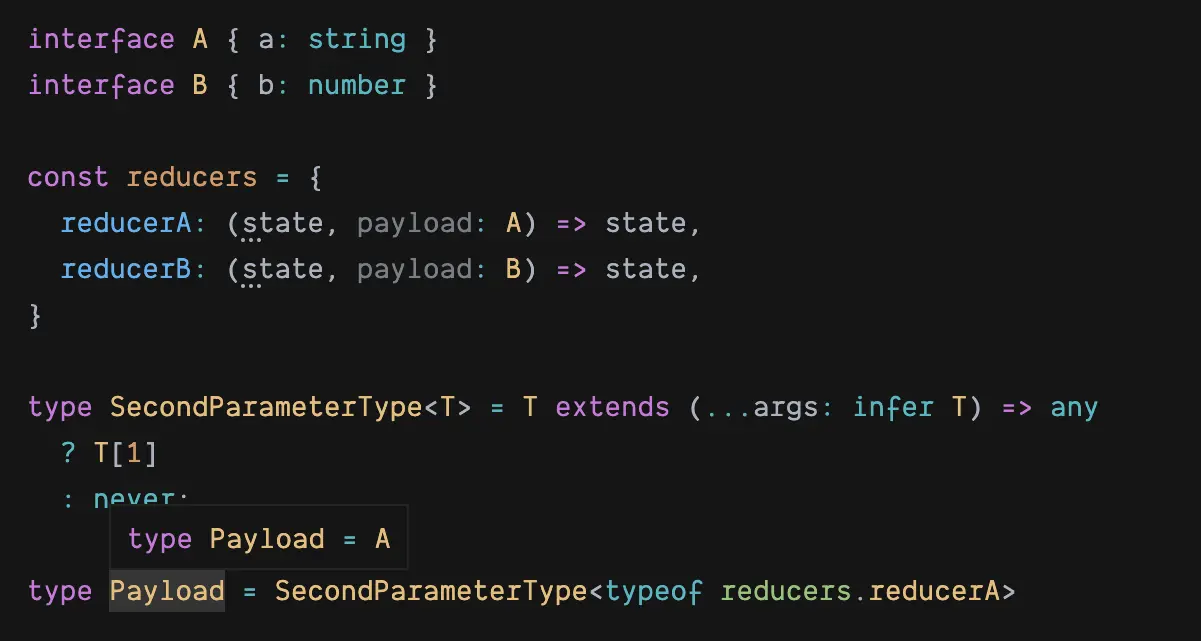 接下来要设置 payload 参数类型,关键是如何拿到一个已知的函数类型定义中的第二个参数的类型。TS 里提供了 infer 关键字用于提取类型。