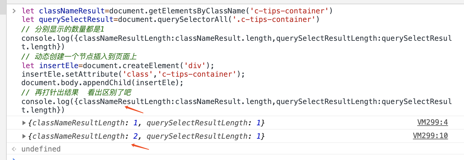 也就是说getElementsByClassName返回的结果是实时动态的,这也是为什么看到一些讲性能优化的文章讲如果需要遍历循环getElementsByClassName结果的时候会让你用声明临时变量把length存起来来进行遍历 类似于下面这样: