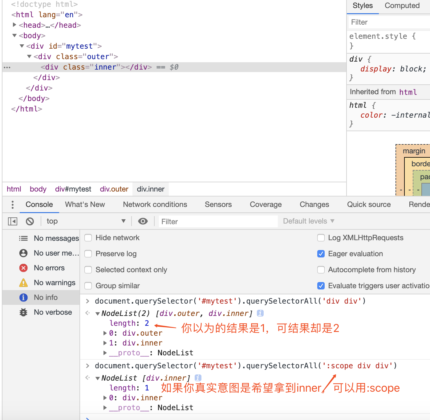 原因:querySelectorAll里面的选择器是全局匹配模式 所以上面浏览器执行的语义是查询#mytest的子元素,同时满足整个页面下div div选择器条件的DOM元素们