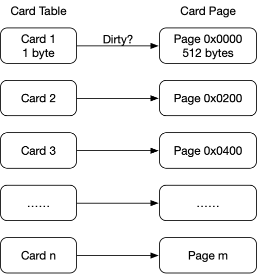 其中,上述第三种“卡精度”指的是用一种“卡表(Card Table)”的方式来实现记忆集,也是目前最常用的实现方式。