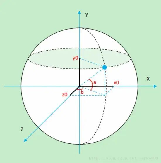 x0 = R * cos(a) * sin(b);y0 = R * sin(a);z0 = R * cos(a) * cos(b);