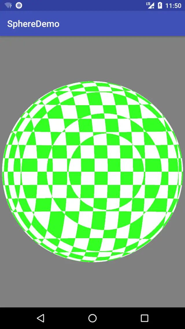 public class SphereFilter { private static final String VERTEX_SHADER = "uniform mat4 u_Matrix;//最终的变换矩阵\n" + "attribute vec4 a_Position;//顶点位置\n" + "varying vec4 vPosition;//用于传递给片元着色器的顶点位置\n" + "void main() {\n" + " gl_Position = u_Matrix * a_Position;\n" + " vPosition = a_Position;\n" + "}"; private static final String FRAGMENT_SHADER = "precision mediump float;\n" + "varying vec4 vPosition;\n" + "void main() {\n" + " float uR = 0.6;//球的半径\n" + " vec4 color;\n" + " float n = 8.0;//分为n层n列n行\n" + " float span = 2.0*uR/n;//正方形长度\n" + " //计算行列层数\n" + " int i = int((vPosition.x + uR)/span);//行数\n" + " int j = int((vPosition.y + uR)/span);//层数\n" + " int k = int((vPosition.z + uR)/span);//列数\n" + " int colorType = int(mod(float(i+j+k),2.0));\n" + " if(colorType == 1) {//奇数时为绿色\n" + " color = vec4(0.2,1.0,0.129,0);\n" + " } else {//偶数时为白色\n" + " color = vec4(1.0,1.0,1.0,0);//白色\n" + " }\n" + " //将计算出的颜色给此片元\n" + " gl_FragColor = color;\n" + "}"; private float radius = 1.0f; // 球的半径 final double angleSpan = Math.PI / 90f; // 将球进行单位切分的角度 private FloatBuffer mVertexBuffer;// 顶点坐标 int mVertexCount = 0;// 顶点个数,先初始化为0 // float类型的字节数 private static final int BYTES_PER_FLOAT = 4; // 数组中每个顶点的坐标数 private static final int COORDS_PER_VERTEX = 3; private int mProgramHandle; private int muMatrixHandle; private int maPositionHandle; private float[] mMVPMatrix = new float[16]; public SphereFilter() { initSphereVertex(); createProgram(); Matrix.setIdentityM(mMVPMatrix, 0); } /** * 计算球面顶点 */ public void initSphereVertex() { ArrayList<Float> vertex = new ArrayList<Float>(); for (double vAngle = 0; vAngle < Math.PI; vAngle = vAngle + angleSpan) { // vertical for (double hAngle = 0; hAngle < 2 * Math.PI; hAngle = hAngle + angleSpan) { // horizontal float x0 = (float) (radius * Math.sin(vAngle) * Math.cos(hAngle)); float y0 = (float) (radius * Math.sin(vAngle) * Math.sin(hAngle)); float z0 = (float) (radius * Math.cos((vAngle))); float x1 = (float) (radius * Math.sin(vAngle) * Math.cos(hAngle + angleSpan)); float y1 = (float) (radius * Math.sin(vAngle) * Math.sin(hAngle + angleSpan)); float z1 = (float) (radius * Math.cos(vAngle)); float x2 = (float) (radius * Math.sin(vAngle + angleSpan) * Math.cos(hAngle + angleSpan)); float y2 = (float) (radius * Math.sin(vAngle + angleSpan) * Math.sin(hAngle + angleSpan)); float z2 = (float) (radius * Math.cos(vAngle + angleSpan)); float x3 = (float) (radius * Math.sin(vAngle + angleSpan) * Math.cos(hAngle)); float y3 = (float) (radius * Math.sin(vAngle + angleSpan) * Math.sin(hAngle)); float z3 = (float) (radius * Math.cos(vAngle + angleSpan)); vertex.add(x1); vertex.add(y1); vertex.add(z1); vertex.add(x3); vertex.add(y3); vertex.add(z3); vertex.add(x0); vertex.add(y0); vertex.add(z0); vertex.add(x1); vertex.add(y1); vertex.add(z1); vertex.add(x2); vertex.add(y2); vertex.add(z2); vertex.add(x3); vertex.add(y3); vertex.add(z3); } } mVertexCount = vertex.size() / COORDS_PER_VERTEX; float vertices[] = new float[vertex.size()]; for (int i = 0; i < vertex.size(); i++) { vertices[i] = vertex.get(i); } mVertexBuffer = GlUtil.createFloatBuffer(vertices); } /** * 创建Program */ private void createProgram() { mProgramHandle = GlUtil.createProgram(VERTEX_SHADER, FRAGMENT_SHADER); maPositionHandle = GLES20.glGetAttribLocation(mProgramHandle, "a_Position"); muMatrixHandle = GLES20.glGetUniformLocation(mProgramHandle, "u_Matrix"); } /** * 绘制球面 */ public void drawSphere() { GLES20.glUseProgram(mProgramHandle); GLES20.glVertexAttribPointer(maPositionHandle, COORDS_PER_VERTEX, GLES20.GL_FLOAT, false, 0, mVertexBuffer); GLES20.glEnableVertexAttribArray(maPositionHandle); GLES20.glUniformMatrix4fv(muMatrixHandle, 1, false, mMVPMatrix, 0); GLES20.glDrawArrays(GLES20.GL_TRIANGLES, 0, mVertexCount); GLES20.glDisableVertexAttribArray(maPositionHandle); GLES20.glUseProgram(0); } /** * 设置最终的变换矩阵 * @param matrix */ public void setMVPMatrix(float[] matrix) { mMVPMatrix = matrix; }}