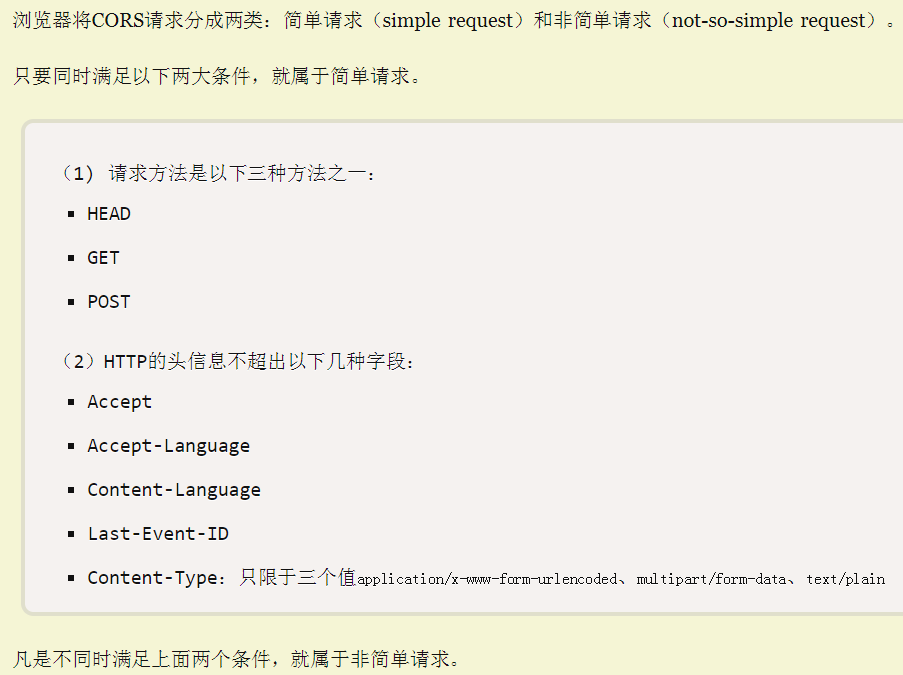 非简单请求是那种对服务器有特殊要求的请求,比如请求方法是PUT或DELETE,或者Content-Type字段的类型是application/json。